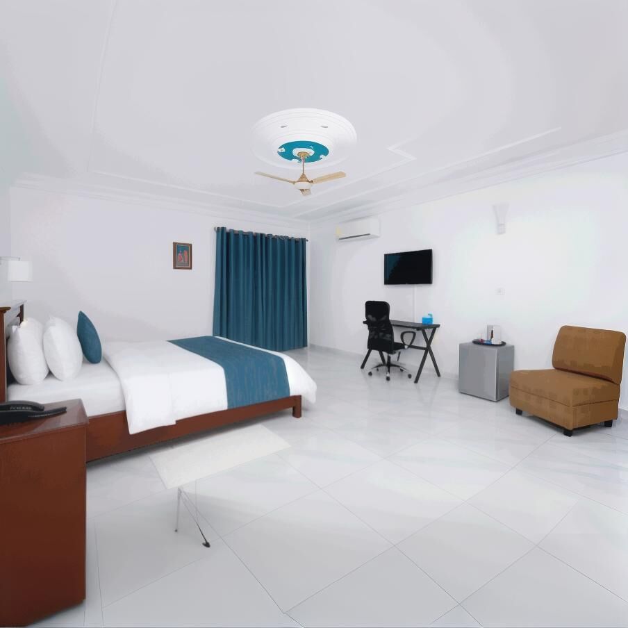 Enjoy sweeping river views from your River Bank Deluxe Room, featuring a plush king-sized bed, flat-screen TV, complimentary WiFi, and a stylish ensuite bathroom. Perfect for romantic getaways or peaceful solo retreats, this room blends comfort with nature, giving you front-row access to Volta’s tranquil beauty—right from your window.